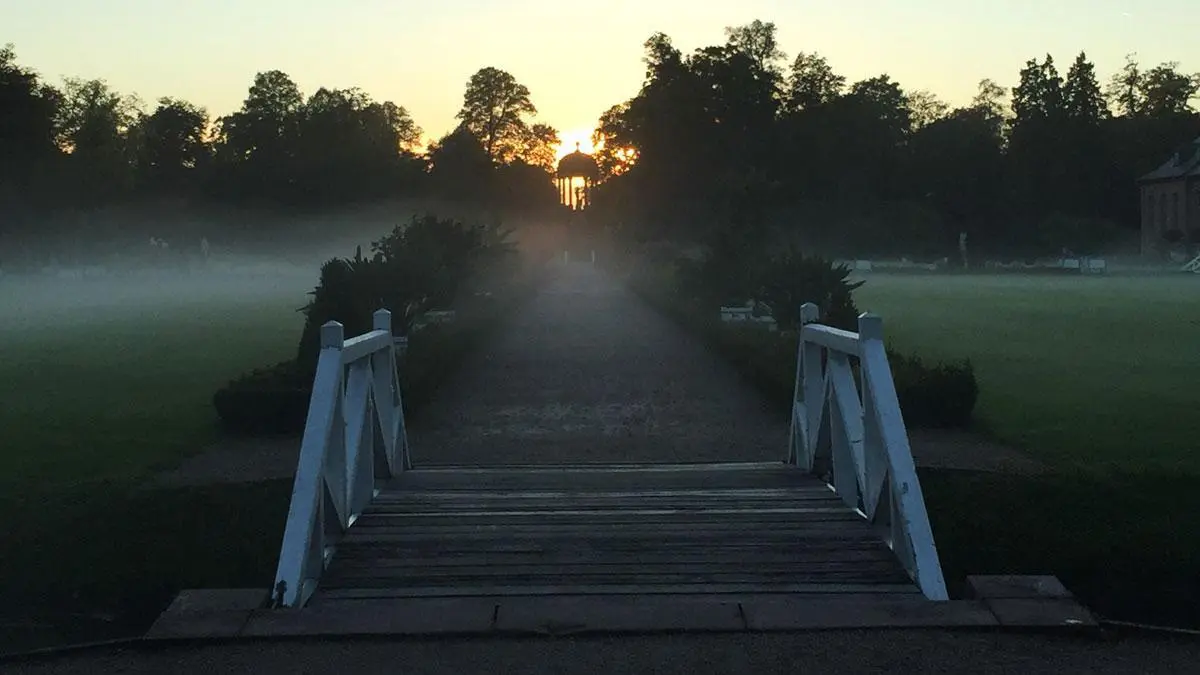Schloss Favorite Rastatt: links Blick in Richtung Schloss, rechts in die Gegenrichtung.