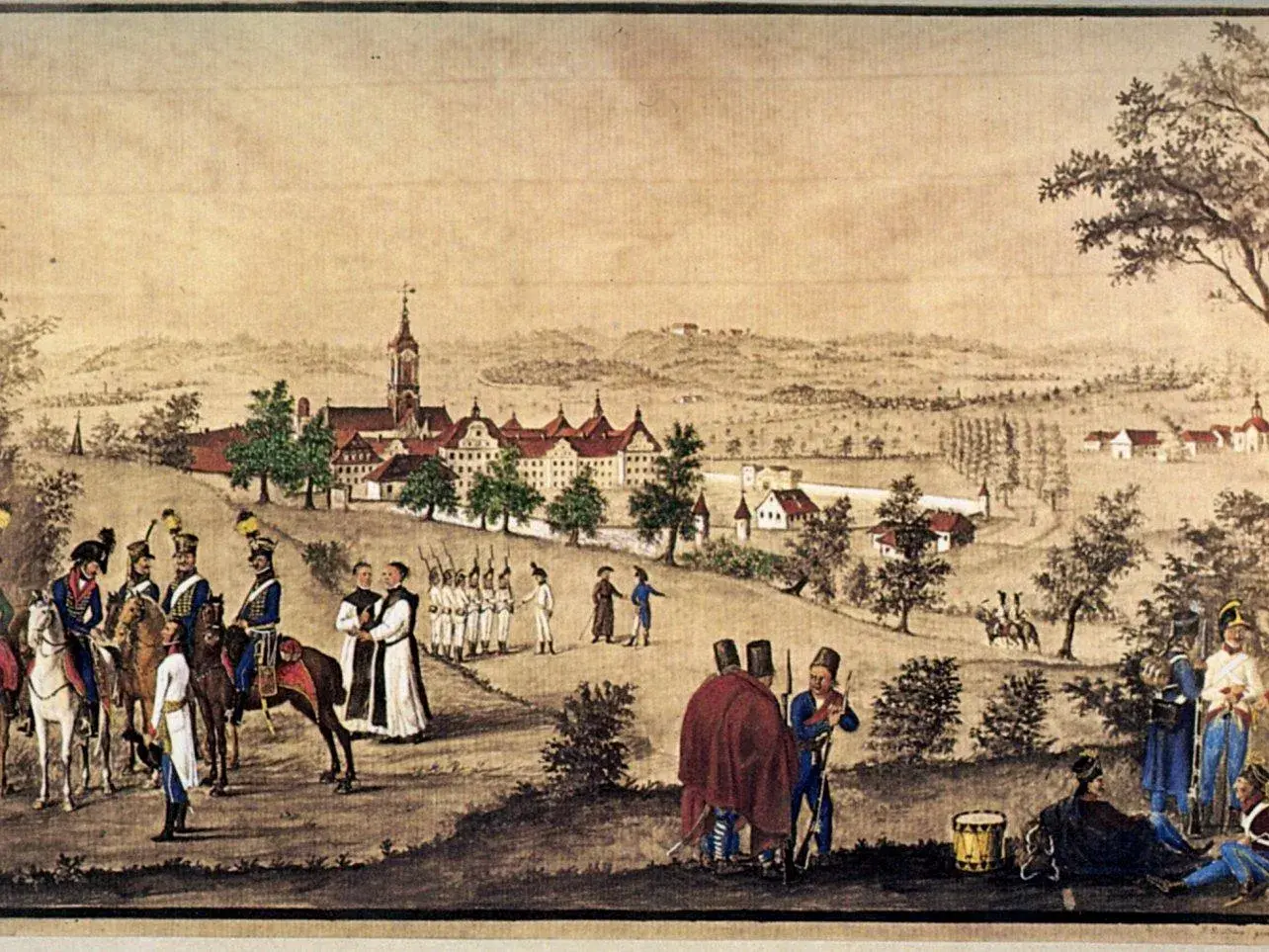 Österreichisches Militär vor dem Kloster Salem, Farbgebung rekonstruiert, Johann Sebastian Dir, 1804, Foto: Wikimedia-Commons, Urheber unbekannt